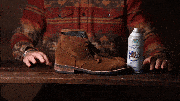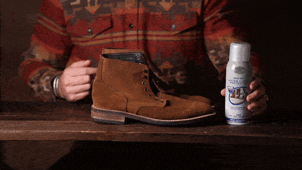 Holding the nozzle 6-10 inches away, apply an even coating of suede spray to your boots or shoes. Note that they may initially appear darker, but the leather will lighten up as they dry.